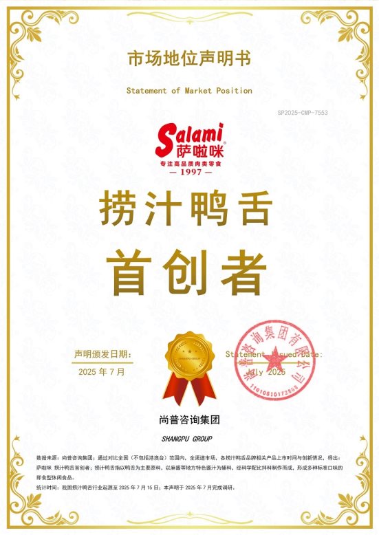 2025年7月,尚普咨询集团向萨啦咪颁发重量级市场地位声明书【萨啦咪 捞汁鸭舌首创者】。该项权威声明,是对萨啦咪开创捞汁鸭舌品类的强力背书,更彰显了市场对其捞汁风味创新贡献的高度认可。